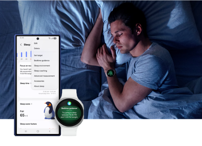 Start building good sleep habits with a little guidance from your Galaxy Watch. It finds your optimal bedtime based on personal data, calculating when you should tuck in to get enough sleep and wake up feeling fully refreshed. Then it sends a notification when the time comes, so you won’t miss out on a good night’s rest.